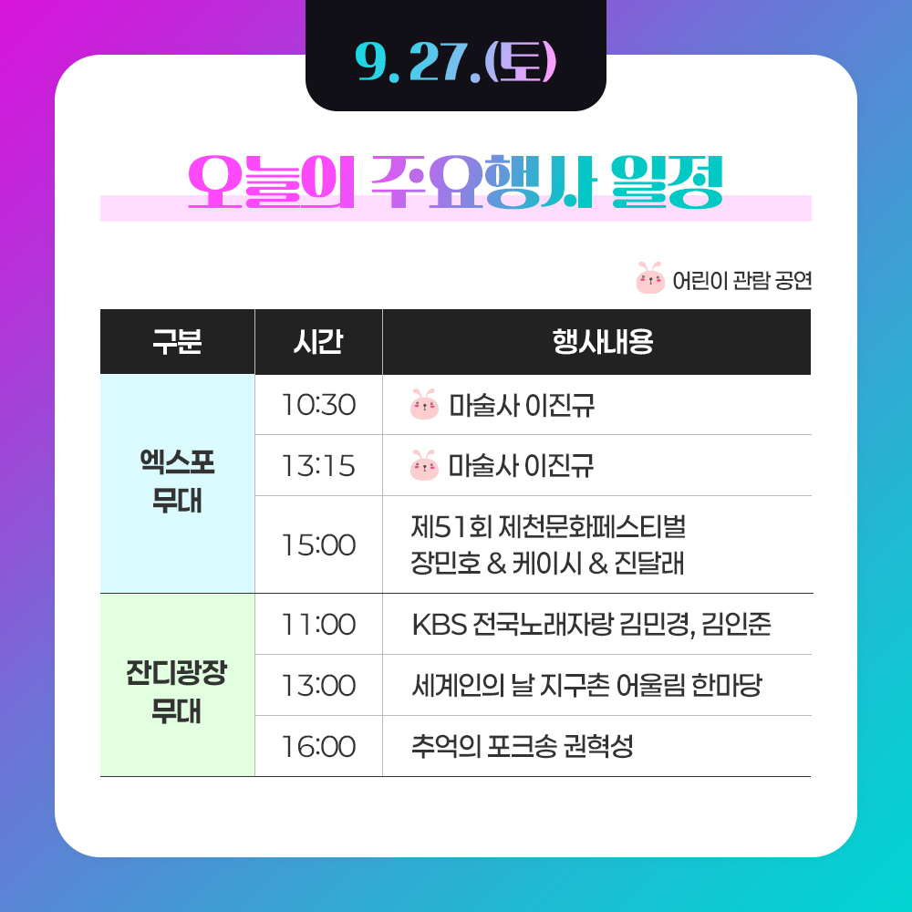 커뮤니티 카드뉴스 2025 제천국제한방천연물산업엑스포의 새로운 소식을 전합니다. 커뮤니티 엑스포안내 산업관 관람신청 행사안내 티켓안내 소식·알림 관광안내 카드뉴스 공지사항 고시공고 엑스포뉴스 포토갤러리 카드뉴스 이벤트 9월27일 주요행사일정 작성일 2025-09-24 작성자 최고관리자 이전글 9월28일 주요행사일정 다음글 9월26일 주요행사일정 목록으로