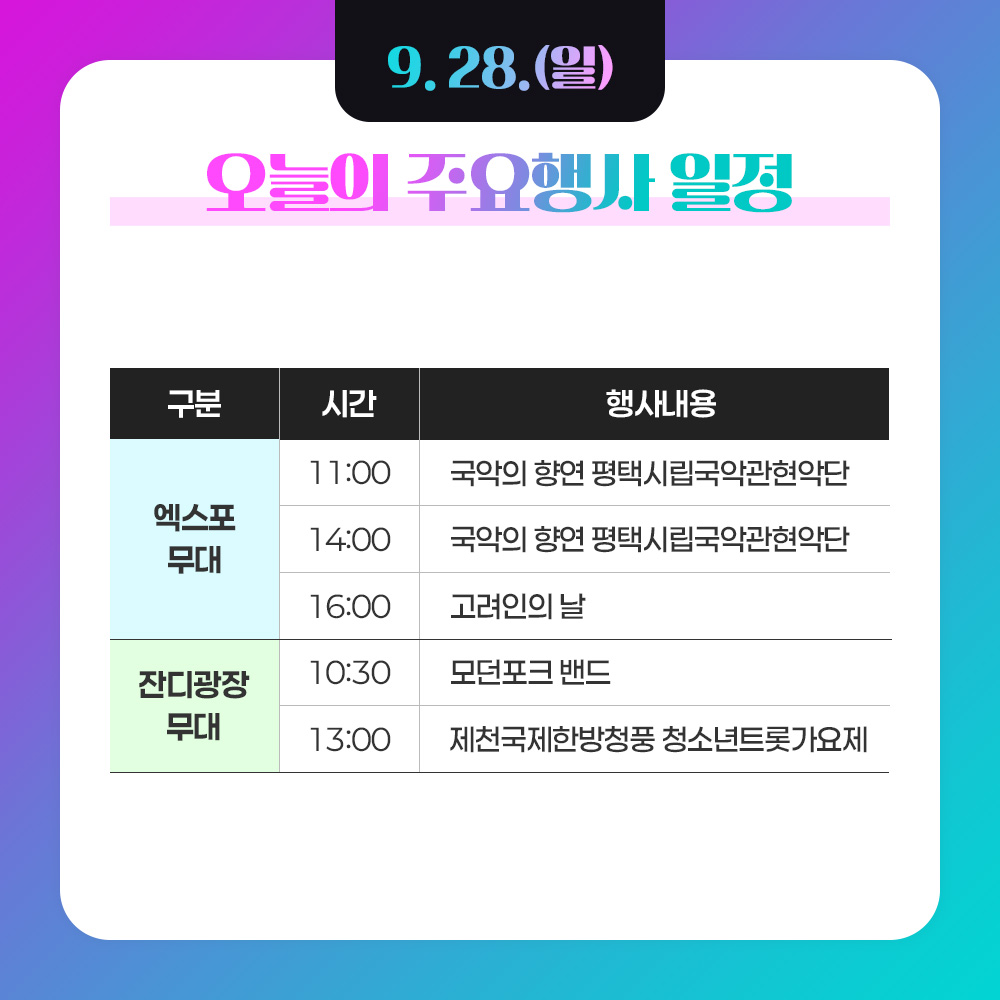 커뮤니티 카드뉴스 2025 제천국제한방천연물산업엑스포의 새로운 소식을 전합니다. 커뮤니티 엑스포안내 산업관 관람신청 행사안내 티켓안내 소식·알림 관광안내 카드뉴스 공지사항 고시공고 엑스포뉴스 포토갤러리 카드뉴스 이벤트 9월28일 주요행사일정 작성일 2025-09-24 작성자 최고관리자 이전글 9월29일 주요행사일정 다음글 9월27일 주요행사일정 목록으로
