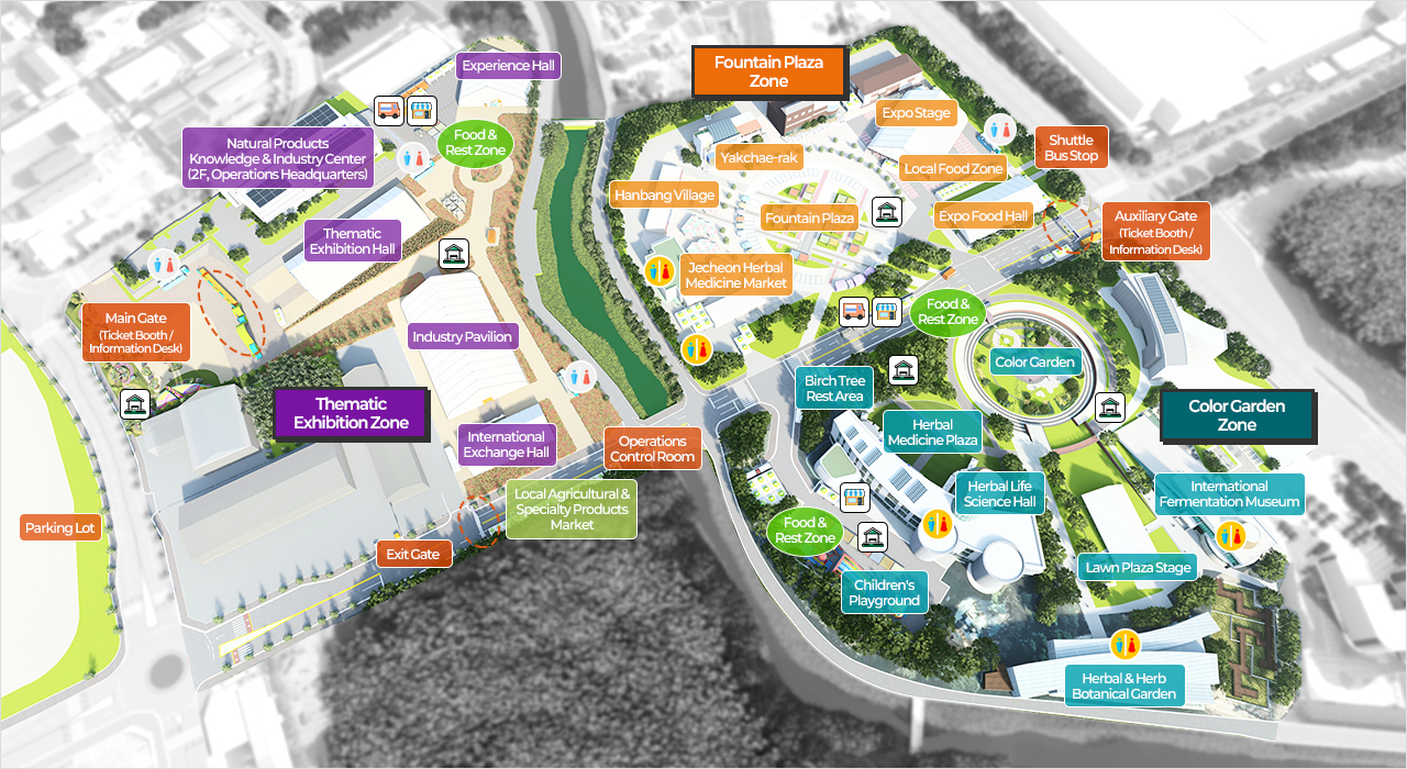 Event information Event Information Information about the venue of 2025 Jecheon Korean Medicine and Natural Product Industry EXPO. Event information Expo Guide Participating Companies Event Information Ticket Information Tourist Information Event Information Event Information Official Event Program Guide Exhibition Hall Guide Legend Rest Area Food Truck Zone Convenience Store Temporary Restrooms Permanent Restrooms