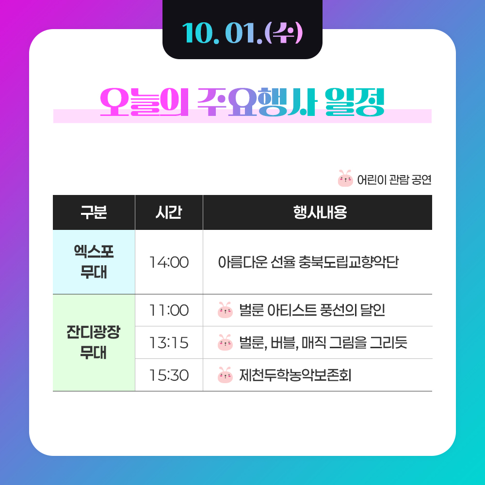 커뮤니티 카드뉴스 2025 제천국제한방천연물산업엑스포의 새로운 소식을 전합니다. 커뮤니티 엑스포안내 산업관 관람신청 행사안내 티켓안내 소식·알림 관광안내 카드뉴스 공지사항 고시공고 엑스포뉴스 포토갤러리 카드뉴스 이벤트 10월1일 주요행사일정 작성일 2025-09-29 작성자 최고관리자 이전글 10월2일 주요행사일정 다음글 평일 무제한 재입장제 시행 목록으로