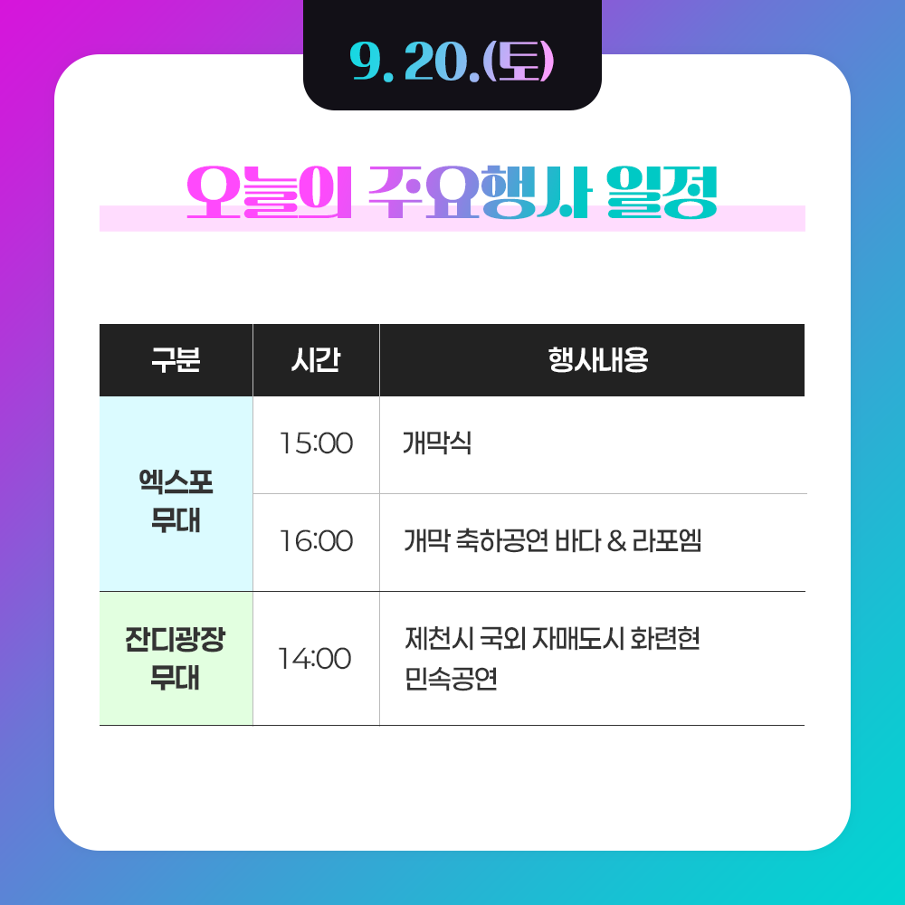 커뮤니티 카드뉴스 2025 제천국제한방천연물산업엑스포의 새로운 소식을 전합니다. 커뮤니티 엑스포안내 산업관 관람신청 행사안내 티켓안내 소식·알림 관광안내 카드뉴스 공지사항 고시공고 엑스포뉴스 포토갤러리 카드뉴스 이벤트 9월20일 주요행사일정 작성일 2025-09-19 작성자 조직위원회 이전글 9월21일 주요행사일정 다음글 2025 약채락 페스티벌 목록으로